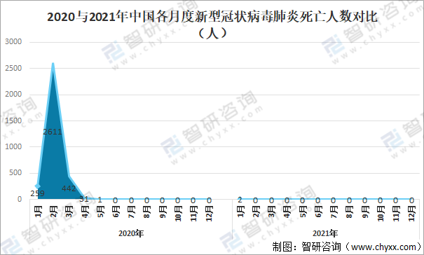 2020与2021年中国各月度新型冠状病毒肺炎死亡人数对比(人)