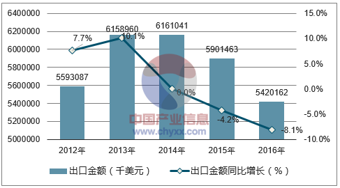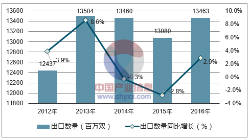 2016年中国织物制袜子出口数量为13463百万双,同比增长2.9%;2016年中国织物制袜子出口金额为5420162千美元,同比下降8.1%。