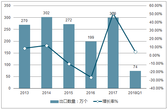 2018年一季度中国出口集装箱74万个,同比增长4.5%。纵观2013-2017年我国集装箱出口量情况,除2017年集装箱出口量急速下滑外,出口量整体波动不大,年均复合增长率为2.67%。