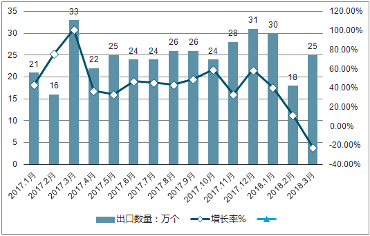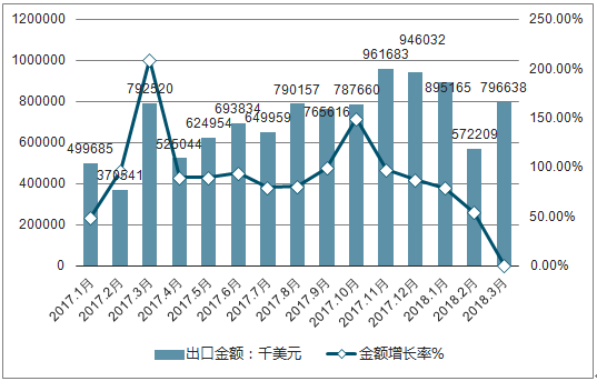 2017-2018年一季度中国集装箱出口金额及增长率走势