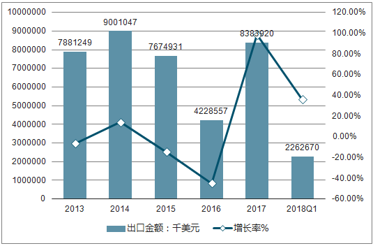 2013-2018年一季度中国集装箱出口金额及增长率走势