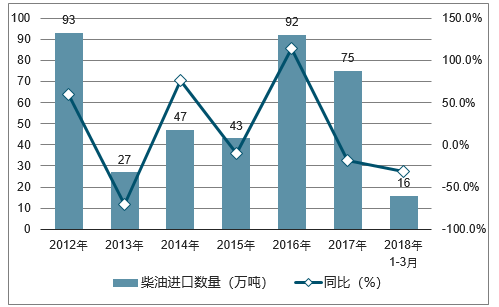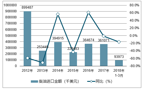2018年1-3月中国柴油进口数量为16万吨,同比下降31.4%;2018年1-3月中国柴油进口金额为93973千美元,同比下降16.2%。