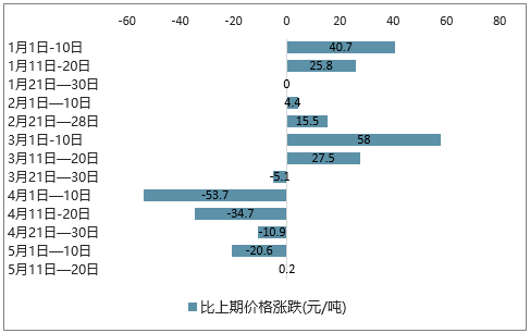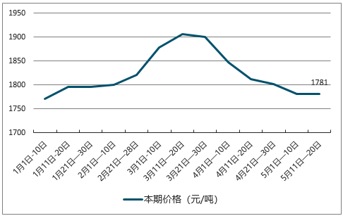 截止至2018年5月中旬,玉米(黄玉米二等)价格为1781元/吨,环比5月上旬价格上涨0.2元/吨;3月中旬,玉米(黄玉米二等)市场价格达到最高值,为1905.8元/吨,环比3月上旬价格上涨27.5元/吨,涨幅为1.5%。1月上旬,玉米(黄玉米二等)价格呈现最低值,为1770.2元/吨,环比2017年12月下旬上涨40.7元/吨,涨幅为2.4%。最高值与最低值相差135.6元/吨。