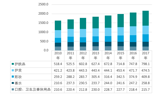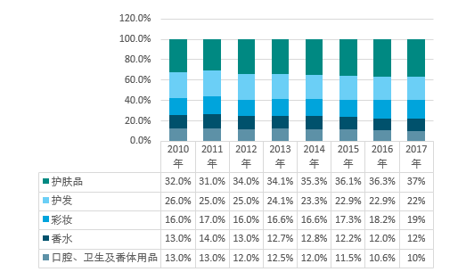 2010-2017年全球化妆品各细分产品市场份额变动趋势