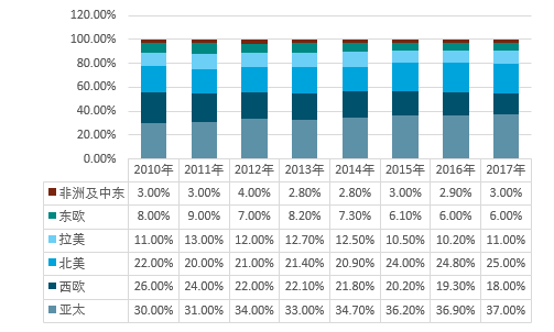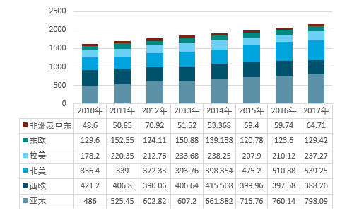 2010-2017年全球各区域化妆品市场规模变动趋势
