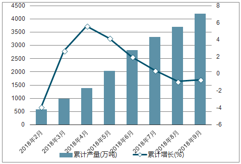2018年2-9月中国原盐各月累计产量及同比增长走势