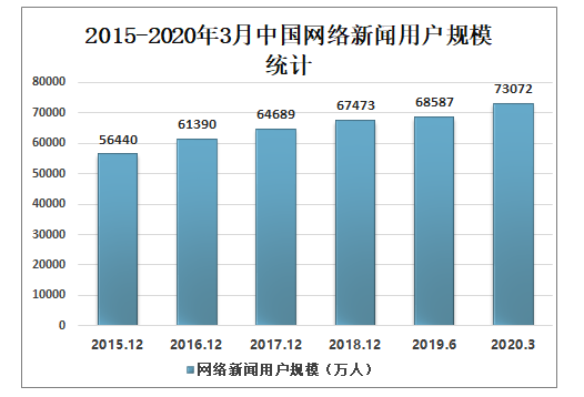 2015-2020年3月中国网络新闻用户规模持续增长,2019上半年中国网络新闻用户规模为68587万人,较2018年年底增加了1114万人,2020年受新冠肺炎疫情的影响,中国网络新闻用户规模迅速增长,2020年3月中国网络新闻用户规模为73072万人,较2019上半年增加了4485万人。