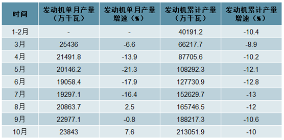 201910月中国发动机产量为23843万千瓦,同比增长7.6%;2019年1-10月中国发动机产量为213051.9万千瓦,同比下降10%。2019年1-10月中国发动机产量及增速统计表