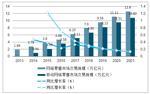 2018年网络零售市场交易规模达7.90万亿元,其中移动网络零售市场规模达6.65亿元,占比近85%。预计2020年网络零售市场交易规模为11.11万亿元,2021年网络零售市场交易规模将达12.6万亿元。2013-2021年中国网络零售市场交易规模