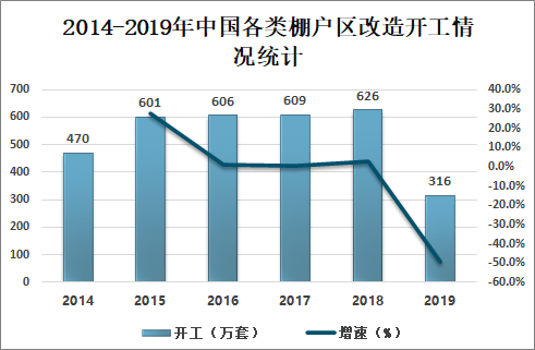 2014-2018年中国各类棚户区改造开工逐年增加,2018年中国各类棚户区改造开工626万套,同比增长2.8%,2019年较2018年有所回落,2019年中国各类棚户区改造开工316万套,同比减少49.5%。