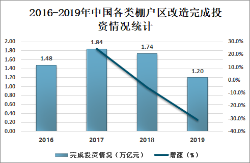 2017-2019年中国各类棚户区改造完成投资逐年减少,2018年中国各类棚户区改造完成投资1.74万亿元,同比减少5.4%;2019年中国各类棚户区改造完成投资1.20万亿元,同比减少31.0%。