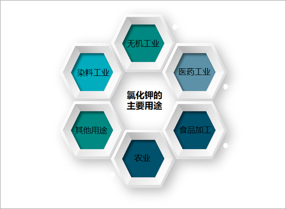 氯化钾主要用于无机工业,是制造各种钾盐或碱如氢氧化钾、硫酸钾、硝酸钾、氯酸钾、红矾钾等的基本原料。医药工业用作利尿剂及防治缺钾症的药物。染料工业用于生产G盐,活性染料等。农业上则是一种钾肥。其肥效快,直接施用于农田,能使土壤下层水分上升,有抗旱的作用.但在盐碱地及对烟草、甘薯、甜菜等作物不宜施用。氯化钾口感上与氯化钠相近(苦涩),也用作低钠盐或矿物质水的添加剂。此外,还用于制造枪口或炮口的消焰剂,钢铁热处理剂,以及用于照相。它还可用于医药,科学应用,食品加工,食盐里面也可以以部分氯化钾取代氯化钠,以降低高血压的可能性。氯化钾的主要用途