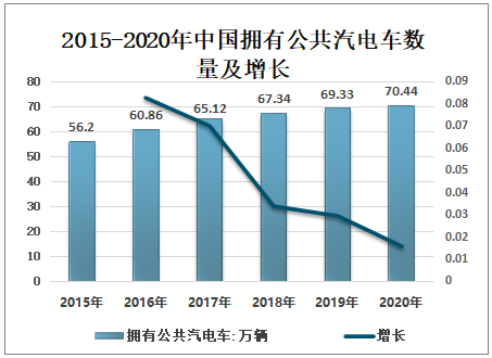 2015-2020年中国拥有公共汽电车数量呈增长趋势,增幅放缓,2020年中国拥有公共汽电车70.44万辆,同比增长1.60%,较2019年下降1.36个百分点。
