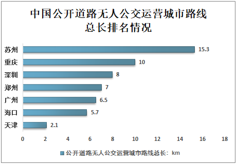 目前,中国已有苏州、重庆、深圳、郑州、广州、海口、天津7座城市部署有在公开道路运营的无人公交路线。从中国公开道路无人公交运营城市路线总长来看,苏州公开道路无人公交运营城市路线总长15.3km,位于全国第一;其次是重庆,公开道路无人公交运营城市路线总长10km;第三是深圳,公开道路无人公交运营城市路线总长8km。