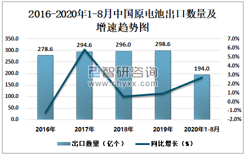2016-2020年1-8月中国原电池出口数量及增速趋势图