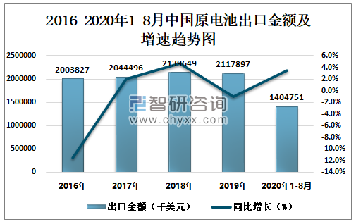 2016-2020年1-8月中国原电池出口金额及增速趋势图