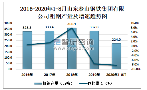 根据冶金工业信息中心数据显示:2020年1-8月山东泰山钢铁集团有限公司钢材产量为293.7万吨,同比下降5.3%;粗钢产量为224.0万吨,同比下降8.2%;生铁产量为199.2万吨,同比下降1.5%。