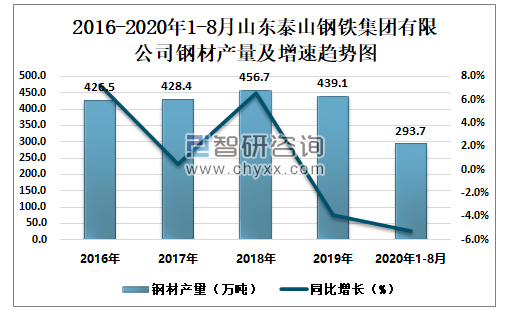 2016-2020年1-8月山东泰山钢铁集团有限公司钢材产量及增速趋势图