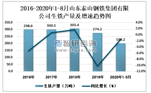 2016-2020年1-8月山东泰山钢铁集团有限公司生铁产量及增速趋势图