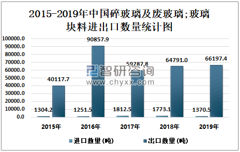 2015-2019年中国碎玻璃及废玻璃;玻璃块料 进出口数量统计图