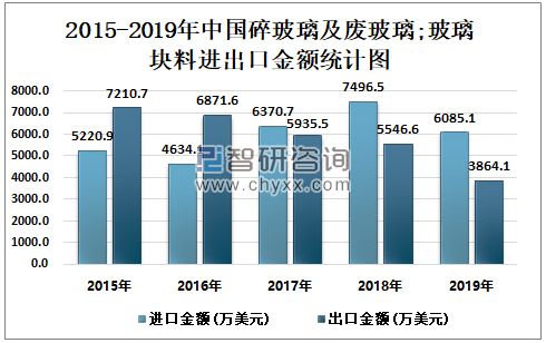 2015-2019年中国碎玻璃及废玻璃;玻璃块料 进出口金额统计图