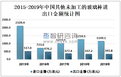 2015-2019年中国其他未加工的玻璃棒 进出口金额统计图
