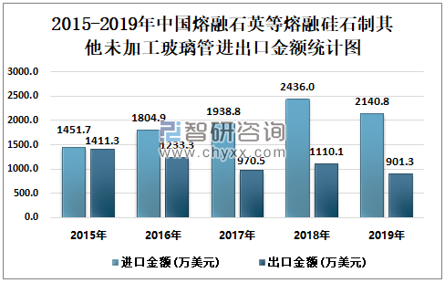根据中国海关数据显示:2019年1-12月中国熔融石英等熔融硅石制其他未加工玻璃管进口数量为935.2吨,进口金额为2140.8万美元;2019年1-12月中国熔融石英等熔融硅石制其他未加工玻璃管出口数量为831.6吨,出口金额为901.3万美元。
