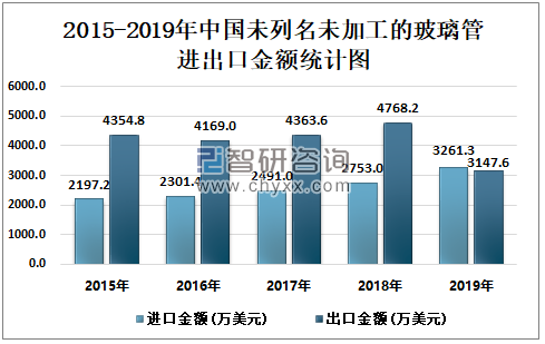 2015-2019年中国未列名未加工的玻璃管 进出口金额统计图