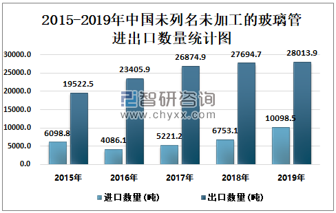根据中国海关数据显示:2019年1-12月中国未列名未加工的玻璃管进口数量为10098.5吨,进口金额为3261.3万美元;2019年1-12月中国未列名未加工的玻璃管出口数量为28013.9吨,出口金额为3147.6万美元。