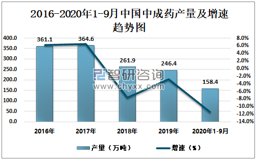 2016-2020年1-9月中国中成药产量及增速趋势图