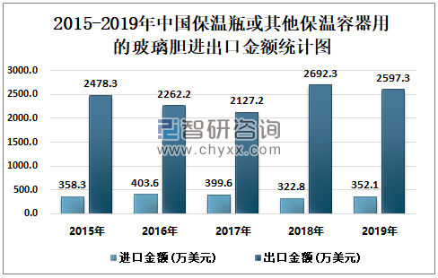 2015-2019年中国保温瓶或其他保温容器用的玻璃胆 进出口金额统计图