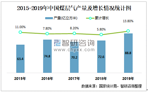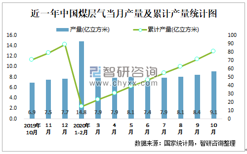 根据国家统计局数据显示:2020年10月中国煤层气产量为9.1亿立方米,同比增长13.5%;2020年1-10月中国煤层气累计产量为80.4亿立方米,累计增长7.9%;2015-2019年中国煤层气产量总体呈现上升趋势,2019年达到最高。