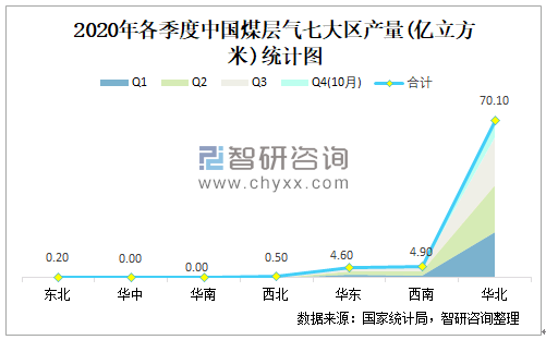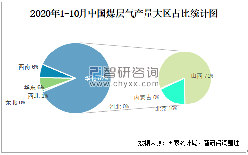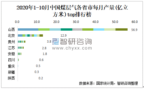 根据国家统计局数据显示:2020年各季度(第4季度暂只统计10月数据)中国煤层气主要集中在华北、西南、华东地区生产;2020年1-10月中国煤层气产量大区分布不均衡,其中华北地区产量最高,特别是山西省贡献了最多产量;2020年1-10月中国煤层气各省产量top1遥遥领先于其他前9名,山西、北京、贵州等省市产量最多。