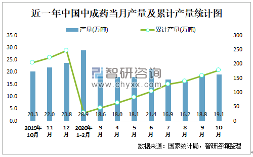 根据国家统计局数据显示:2020年10月中国中成药产量为19.1万吨,同比下降1.5%;2020年1-10月中国中成药累计产量为177.9万吨,累计下降8.8%;2015-2019年中国中成药产量2017年达到最高,此后逐年递减。