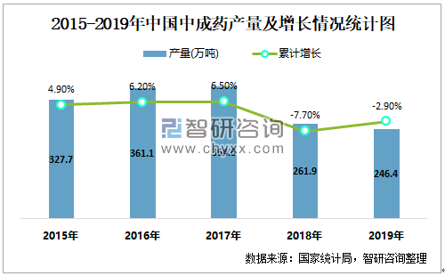 2015-2019年中国中成药产量及增长情况统计图