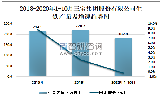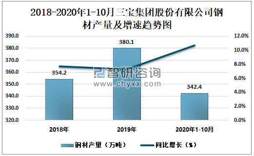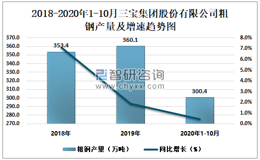 根据冶金工业信息中心数据显示:2020年1-10月三宝集团股份有限公司钢材产量为342.4万吨,同比增长10.7%;粗钢产量为300.4万吨,同比增长0.4%;生铁产量为182.8万吨,同比下降0.2%。