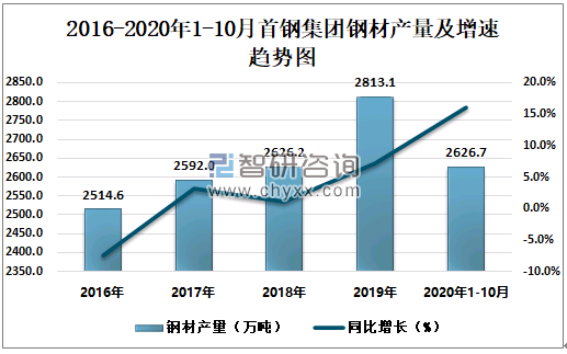 根据冶金工业信息中心数据显示:2020年1-10月首钢集团钢材产量为2626.7万吨,同比增长16.1%;粗钢产量为2795.6万吨,同比增长18.5%;生铁产量为2583.1万吨,同比增长20.7%。