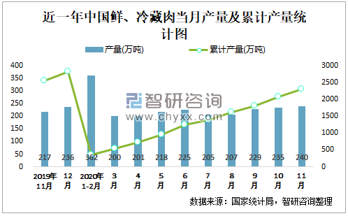 近一年中国鲜、冷藏肉当月产量及累计产量统计图