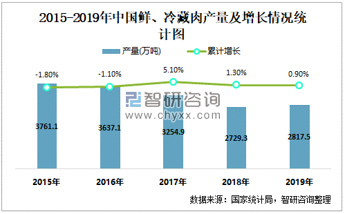 2015-2019年中国鲜、冷藏肉产量及增长情况统计图