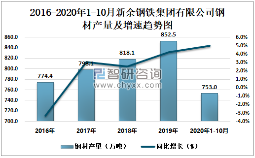 2016-2020年1-10月新余钢铁集团有限公司钢材产量及增速趋势图