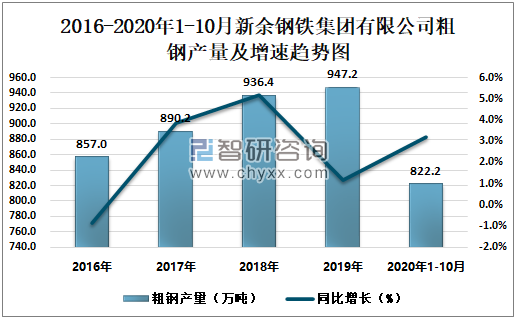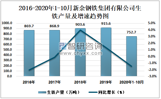 根据冶金工业信息中心数据显示:2020年1-10月新余钢铁集团有限公司钢材产量为753.0万吨,同比增长5.0%;粗钢产量为822.2万吨,同比增长3.2%;生铁产量为752.7万吨,同比下降1.5%。