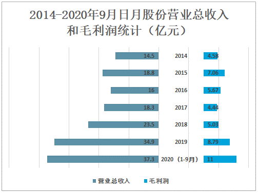 2014-2020年9月日月股份营业总收入和毛利润统计(亿元)