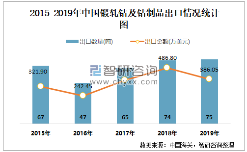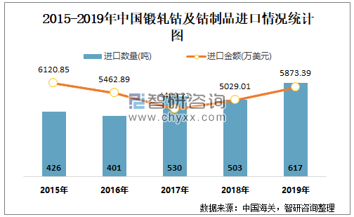 根据中国海关数据显示:2019年1-12月中国锻轧钴及钴制品进口数量为617.04吨,进口金额为5873.39万美元;2019年1-12月锻轧钴及钴制品出口数量为74.7吨,出口金额为386.05万美元。
