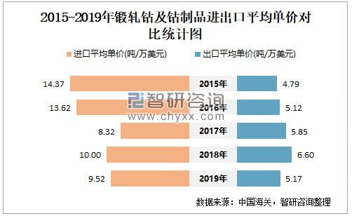 根据中国海关数据统计可知:2015-2019年中国锻轧钴及钴制品出口金额小于进口金额,进出口逆差规模近3年逐年扩大;2015-2019年中国锻轧钴及钴制品进口平均单价波动明显,涨跌幅度较大,出口平均单价均小于进口平均单价。