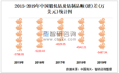 2015-2019年中国锻轧钴及钴制品顺(逆)差统计图
