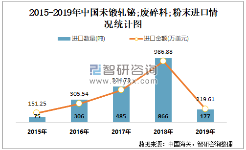 根据中国海关数据显示:2019年1-12月中国未锻轧铋;废碎料;粉末进口数量为177.13吨,进口金额为219.61万美元;2019年1-12月未锻轧铋;废碎料;粉末出口数量为1630.15吨,出口金额为1168.64万美元。