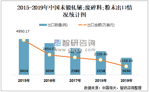 根据中国海关数据显示:2015-2019年中国未锻轧铋;废碎料;粉末进口数量与进口金额均在2018年达到最高值;2015-2019年中国未锻轧铋;废碎料;粉末出口数量与出口金额逐年递减。