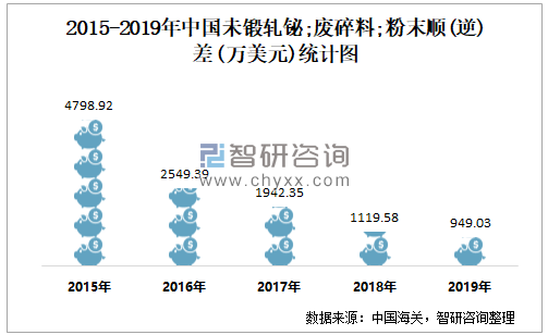 2015-2019年中国未锻轧铋;废碎料;粉末顺(逆)差统计图