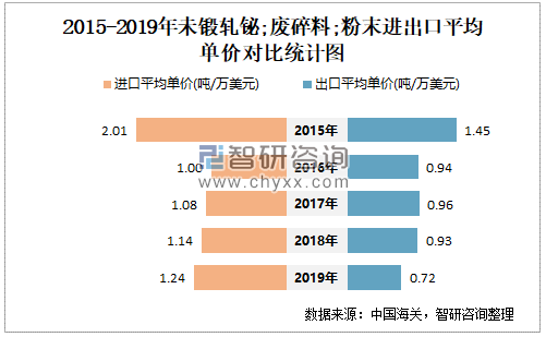 2015-2019年中国未锻轧铋;废碎料;粉末进出口平均单价对比统计图