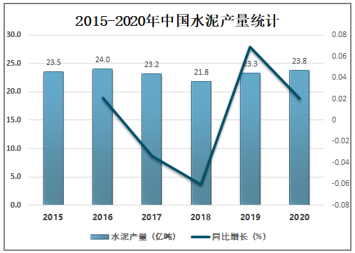 自2019年起中国水泥产量开始恢复增长,2020年中国水泥产量达23.8亿吨,较2019年增加了0.47亿吨,同比增长2.01%。